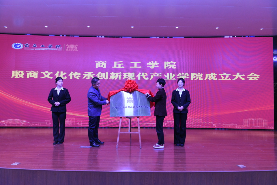 在热烈的掌声中,史新艳局长和石培哲书记共同为商丘工学院殷商文化传承创新现代产业学院揭牌。